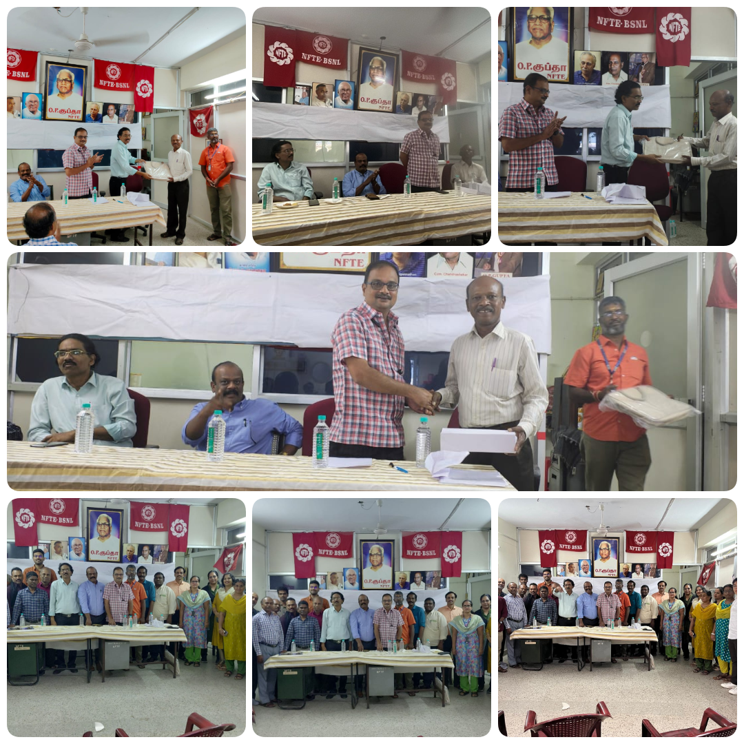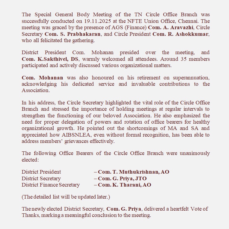 A new Circle body has been unanimously elected, with Com. Ashok Kumar ( AO) as President,  Com. S Prabhakaran (JTO) as Circle Secretary, and Com. K Sakthivel (JAO) as Finance Secretary.