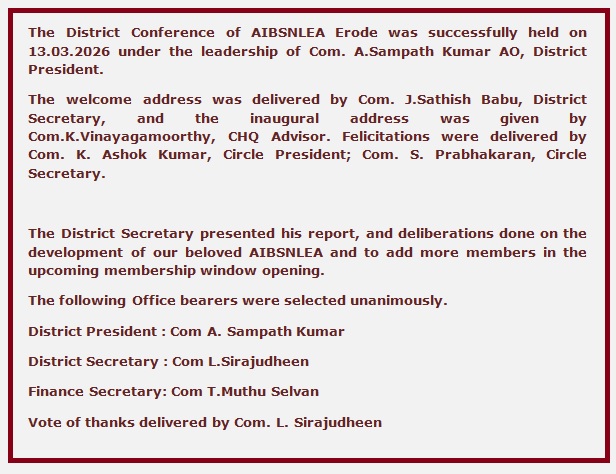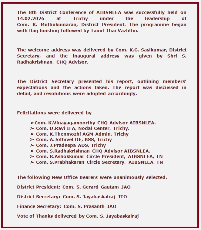 Click Here - AIBSNLEA-Thanjavur District Conference Report sent to CHQ 31.12.2024 Dear Comrades